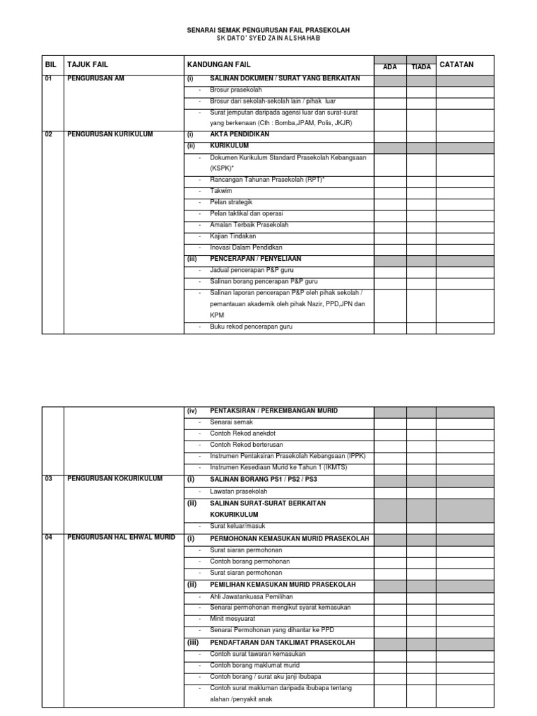 Senarai Semak Pengurusan Fail Prasekolah Jpnj Docx
